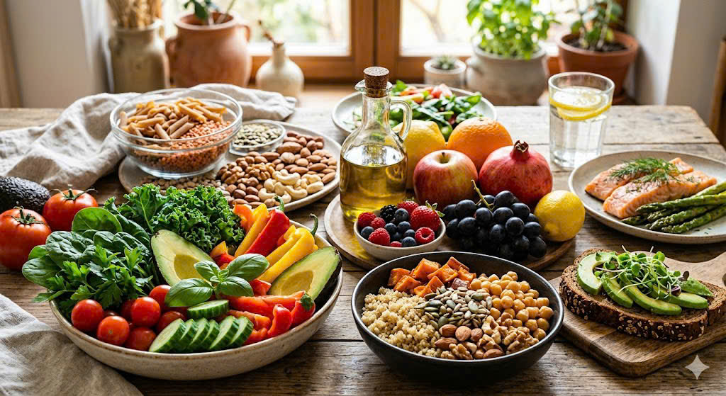 Thành phần chính: Tập trung vào các loại chất béo lành mạnh (dầu ô liu), protein từ cá, các loại hạt, ngũ cốc nguyên hạt, trái cây và rau củ.
